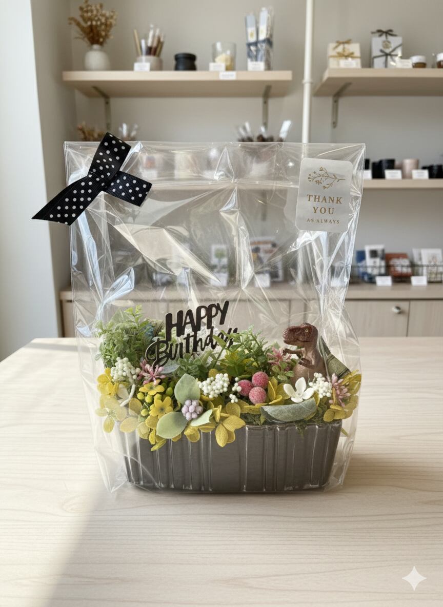 このアレンジメントは、長持ちするため手間いらず。身近な場所でいつでも楽しめる、お子様の心の支えとなるような素敵な贈り物です!